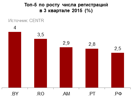 В третьем квартале 2015 года домен .BY демонстрирует самые большие темпы роста в Европе: за три месяца национальная доменная зона Беларуси выросла на 4% по сравнению с предыдущим кварталом, уверенно обогнав португальский домен .PT, возглавлявший топ самых быстрорастущих доменов Европы на протяжении последних 12 месяцев.